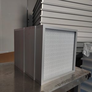 有隔板亚高效过滤器采用超细玻璃纤维滤纸或聚丙烯滤纸为滤材,经密摺而成。密摺的滤纸由纸隔板或铝箔隔板做成的小插件间隔,保持流畅通道,外框可为镀锌板、复合木板或高密度板、不锈钢板或铝合金型材,用新型环保聚氨酯密封胶密封。
